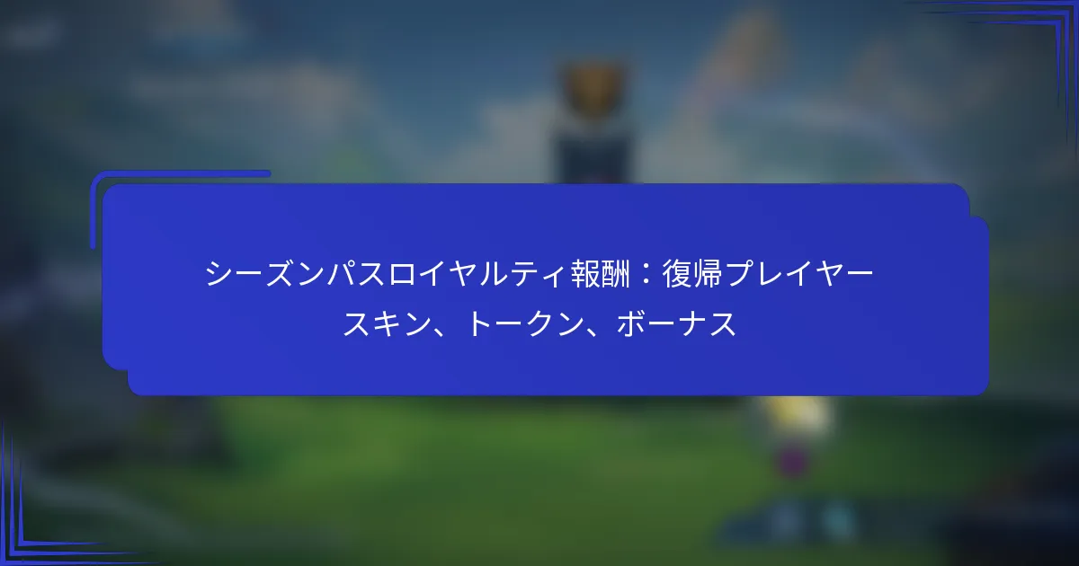 シーズンパスのロイヤルティ報酬は、熱心なプレイヤーに独占的なコンテンツやボーナスを提供し、ゲーム体験を向上させ、継続的な参加を促します。これらの報酬の中には、以前にゲームに参加したプレイヤーのためのユニークなコスメティックオプションを提供する復帰プレイヤースキンが含まれています。さらに、プレイヤーはゲームプレイを通じてトークンを獲得でき、さまざまな報酬をアンロックし、体験をさらにパーソナライズすることができます。 シーズンパスのロイヤルティ報酬とは? シーズンパスのロイヤルティ報酬は、ゲームに継続的に関与するプレイヤーに提供されるインセンティブで、独占的なコンテンツやボーナスを提供します。これらの報酬はゲーム体験を向上させ、復帰プレイヤー向けに調整されたさまざまなインセンティブを通じて継続的な参加を促します。 シーズンパスのロイヤルティ報酬の定義 シーズンパスのロイヤルティ報酬は、通常シーズンパスシステムを通じてゲームへの継続的なコミットメントに対してプレイヤーが受け取る利益を指します。これらの報酬には、ユニークなスキン、ゲーム内通貨、ゲームプレイを向上させるその他のボーナスが含まれます。これらはプレイヤーのロイヤルティを認識し、報いるために設計されており、コミュニティとエンゲージメントの感覚を生み出します。 シーズンパスに参加することで、プレイヤーは進行に応じてこれらの報酬をアンロックし、ゲーム体験をより充実させます。この概念は、ゲームに時間とリソースを投資するプレイヤーに対して具体的な利益を提供することに基づいています。 報酬の種類:復帰プレイヤースキン、トークン、ボーナス シーズンパスのロイヤルティ報酬は、さまざまな形態で提供されます。具体的には: 復帰プレイヤースキン: 忠実なプレイヤーのみが入手できる独占的なキャラクターまたは武器のスキンで、彼らのコミットメントを示すことができます。 トークン: アイテムやアップグレードを購入するために使用できるゲーム内通貨で、プレイヤーの進行能力を向上させます。 ボーナス: 経験値ブーストやイベントへの独占アクセスなどの追加報酬で、プレイヤーにゲームプレイでの利点を提供します。 これらの報酬は、ゲームの視覚的魅力を高めるだけでなく、プレイヤーに貴重なリソースと認識を提供することで、全体的なゲーム体験を向上させます。 ゲームにおけるロイヤルティ報酬の重要性 ロイヤルティ報酬は、プレイヤーの保持とエンゲージメントを促進することで、ゲーム業界において重要な役割を果たします。これらは達成感と認識を生み出し、プレイヤーがゲームに参加し続ける動機付けとなります。これにより、より活気のあるコミュニティとプレイヤーの満足度の向上につながります。 さらに、ロイヤルティ報酬は、プレイヤーがシーズンパスに投資することを促すことで、開発者が安定した収益源を維持するのに役立ちます。プレイヤーが価値を感じ、報われていると感じると、ゲーム内購入や拡張にお金を使う可能性が高まり、プレイヤーと開発者の両方に利益をもたらします。 シーズンパスシステムの概要 シーズンパスシステムは、通常数週間または数ヶ月にわたってコンテンツと報酬を提供するための構造化されたアプローチです。プレイヤーはシーズンパスを購入して独占的なコンテンツにアクセスし、チャレンジをクリアしたりゲームを進めたりすることでアンロックします。 このシステムにより、開発者は新しいゲームプレイ要素や報酬を定期的に導入でき、ゲームを新鮮で魅力的に保つことができます。プレイヤーは報酬を最大化するために頻繁にログインするインセンティブがあり、両者に利益をもたらすエンゲージメントのサイクルを生み出します。 報酬の資格基準 シーズンパスのロイヤルティ報酬を受け取るには、プレイヤーは通常、特定の基準を満たす必要があります。これには、シーズンパスの購入、特定のレベルへの到達、またはゲーム内の指定されたチャレンジの完了が含まれる場合があります。各シーズンには独自の要件があるため、プレイヤーは現在の基準について情報を得て、報酬を逃さないようにする必要があります。 さらに、一部の報酬は階層化されており、プレイヤーは自分のエンゲージメントや活動に基づいて異なるレベルの報酬をアンロックできます。定期的な参加とゲーム内タスクの完了は、ロイヤルティ報酬の利益を最大化するために不可欠です。 復帰プレイヤースキンはどのように機能しますか? 復帰プレイヤースキンは、以前にゲームに参加したプレイヤーのために設計された独占的なコスメティックアイテムです。これらのスキンはユニークな視覚的アイデンティティを提供し、さまざまなゲーム内活動を通じて獲得でき、全体的なゲーム体験を向上させます。 復帰プレイヤースキンの定義と例 復帰プレイヤースキンは、